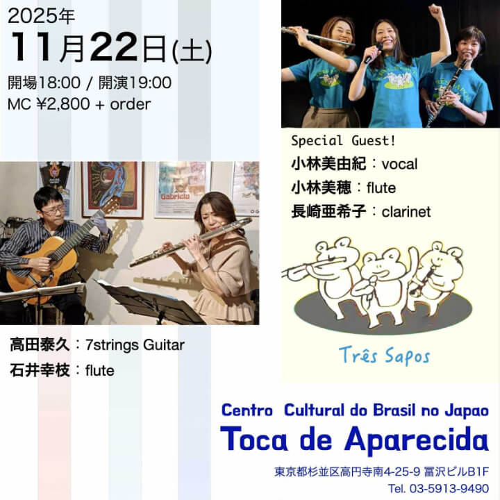 美しくスリリングなショーロ、躍動感いっぱいのサンバ、ボサ・ノヴァ、MPB、ノルデスチ等、ブラジルの様々なジャンルの楽曲を演奏します♪【Tres Sapos】